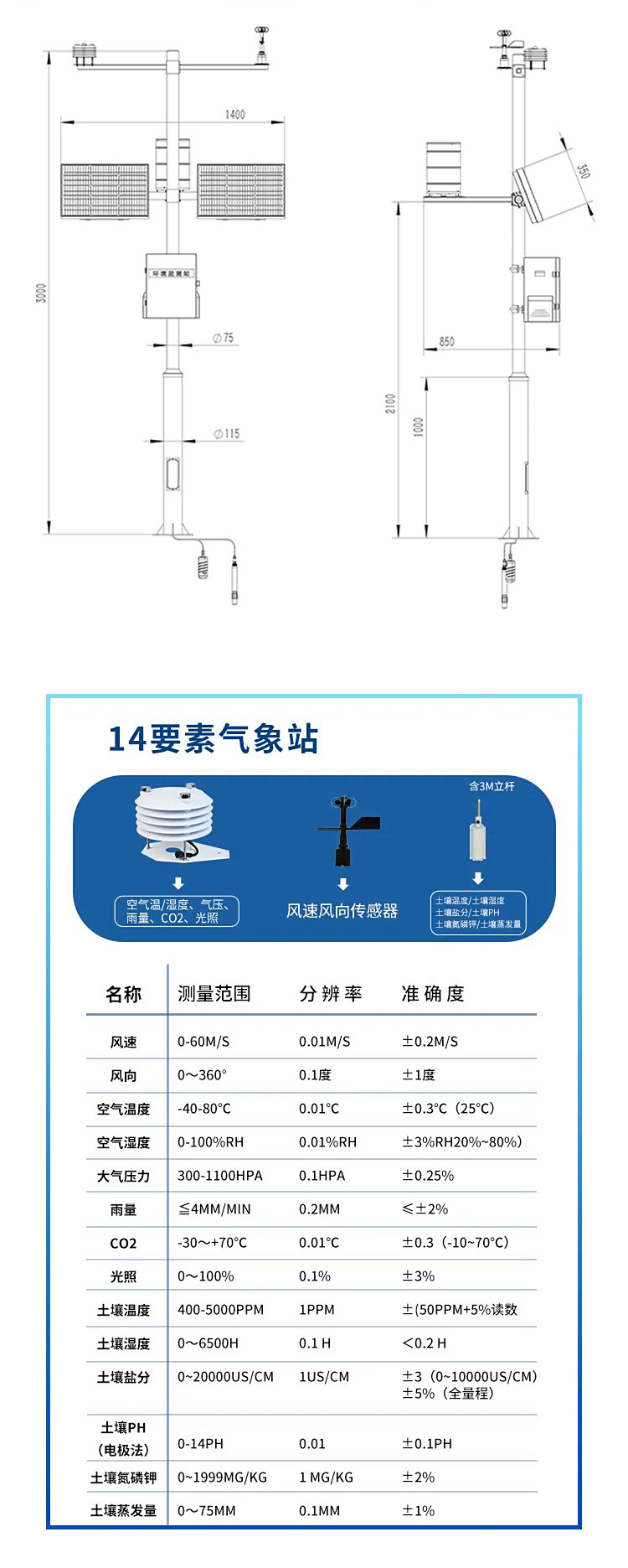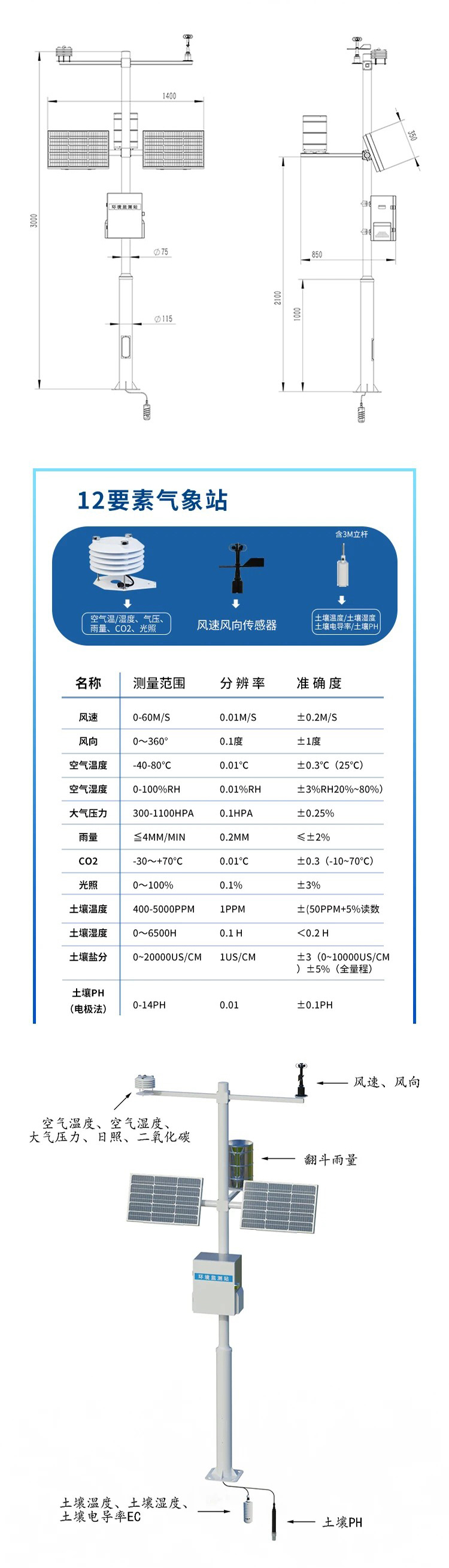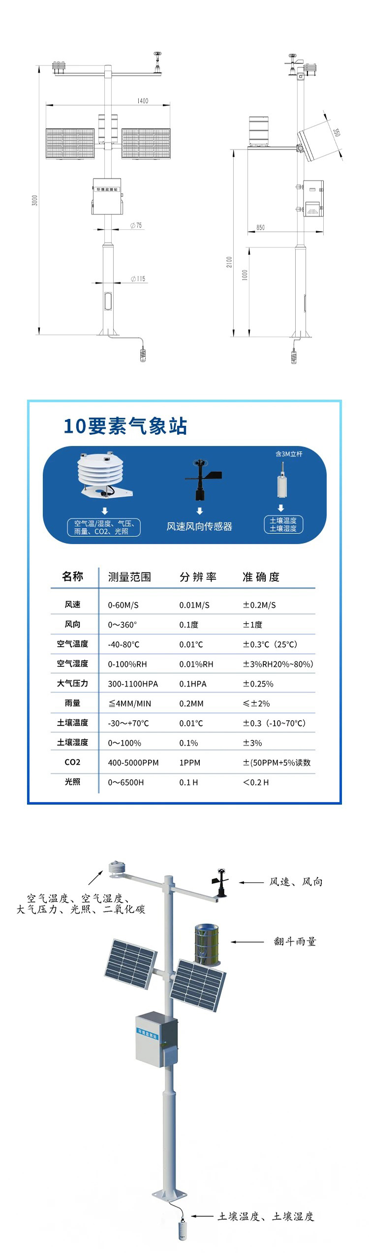 对风速、风向、雨量、空气温度、空气湿度、大气压力等气象主要要素进行全天候现场监测,分类统计分析和处理,应用于气象、农业、地质、环境等方面。