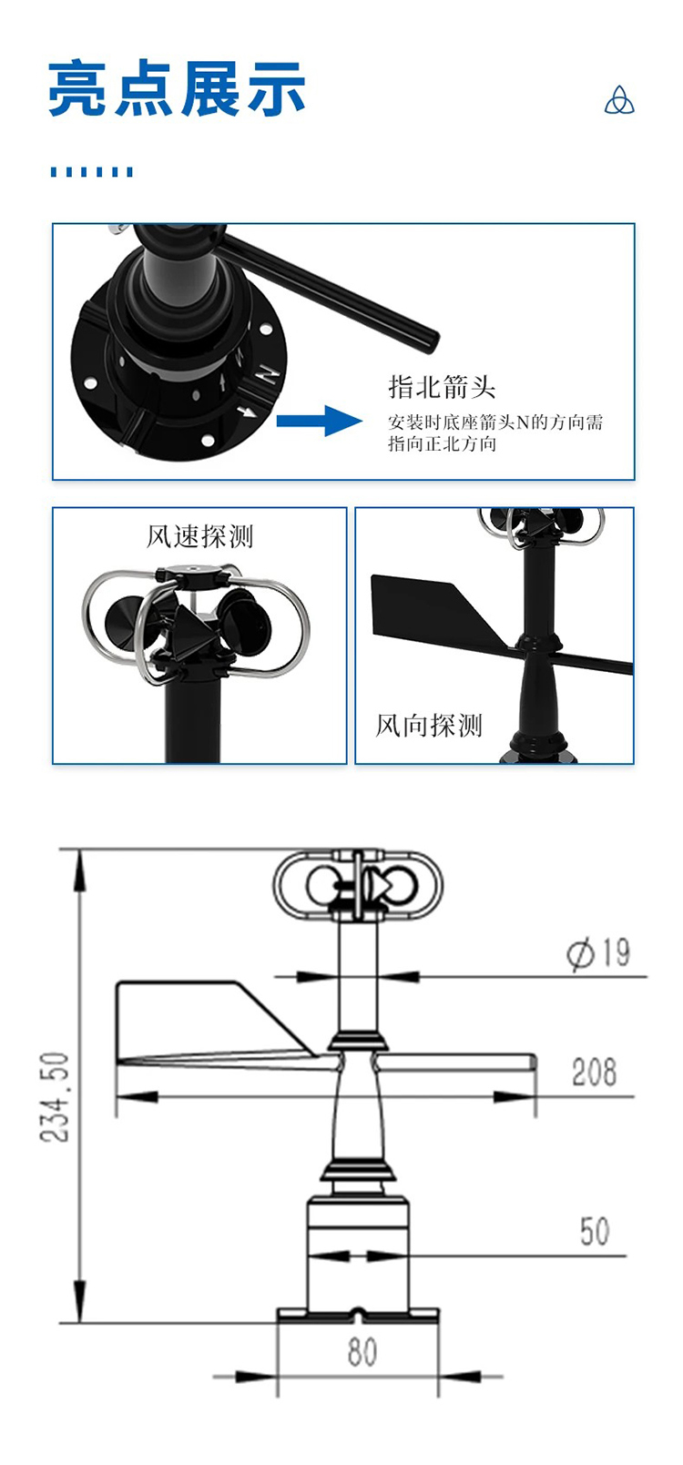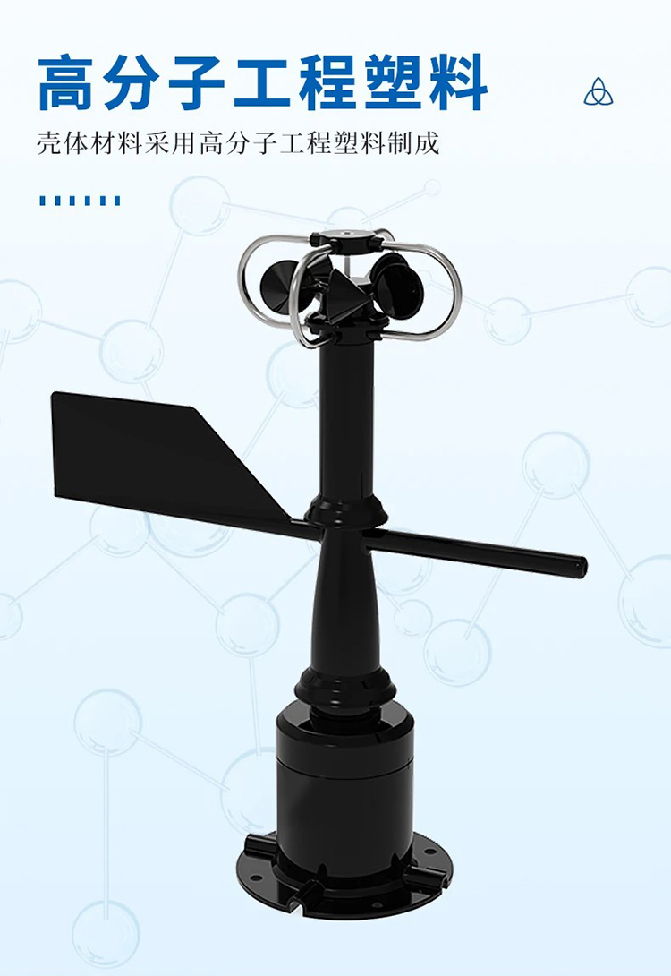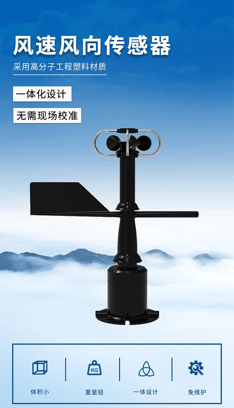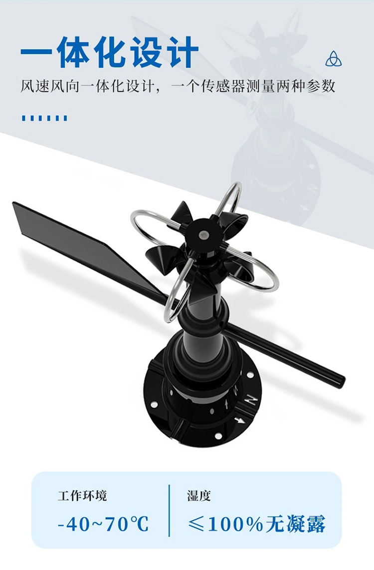 风速风向传感器巧妙完美的将风速传感器和风向传感器结合到了一体,更加方便安装携带,省去了现场布线的,分开安装等繁琐的步骤,同时使用特种模具精密压铸工艺。