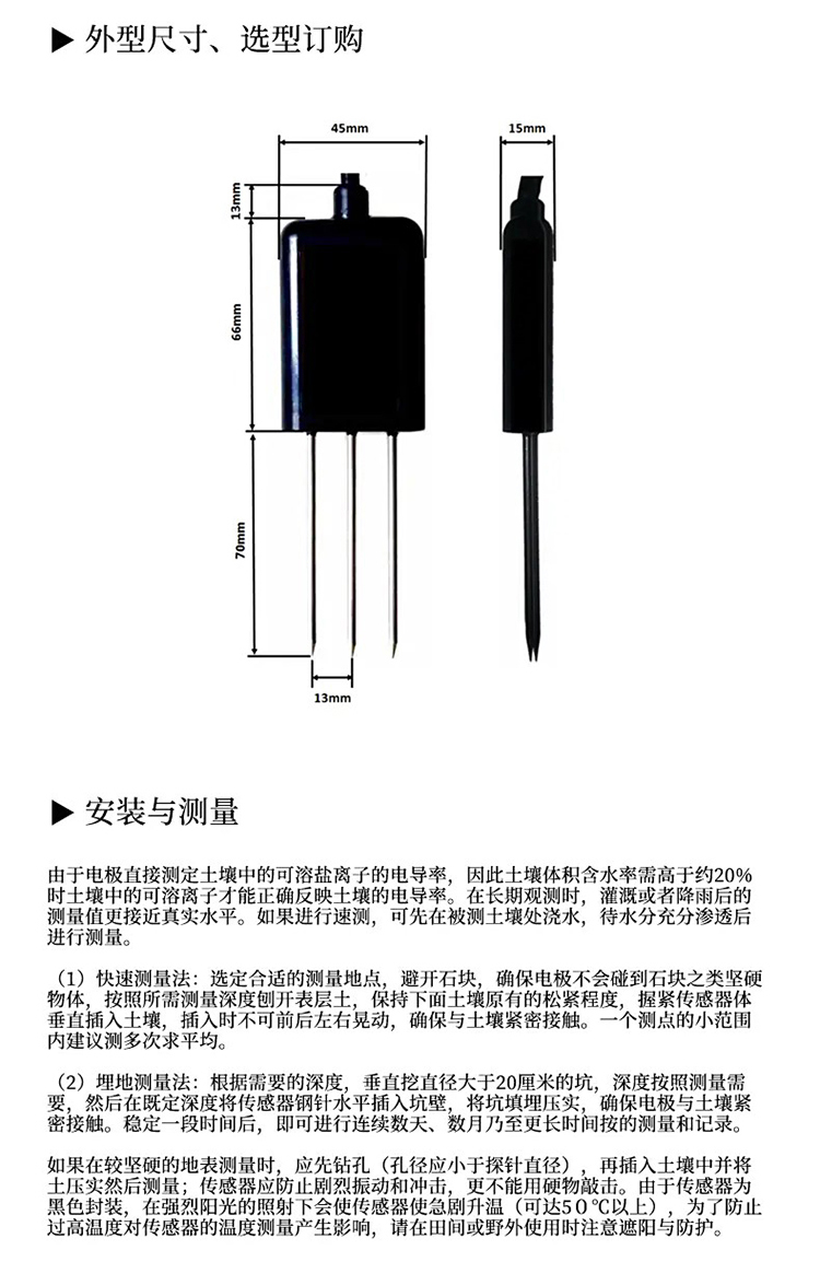 土壤温湿盐传感器又称土壤温湿盐一体传感器,土壤温湿盐传感器性能稳定灵敏度高,是观测和研究盐渍土的发生、演变、改良以及水盐动态的重要工具。