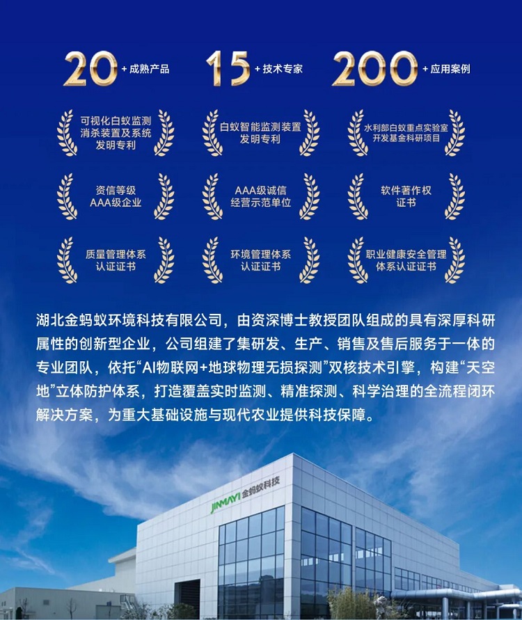 在水利工程安全防线的构筑中,白蚁等害堤动物防治是一场不容有失的“隐形战争”。2025年,江西省某市全面启动水利工程白蚁防治项目,其中,30座小(1)型水库作为智能化防治的试点,率先布设了湖北金蚂蚁环境科技有限公司(以下简称“金蚂蚁科技”)的JMY-VIS智能白蚁可视化监测与灭杀系统。项目实施仅一周后,系统便成功捕捉到白蚁活动图像,并通过AI模型实现了精准识别与预警,标志着“智能防治”从蓝图走向现实。