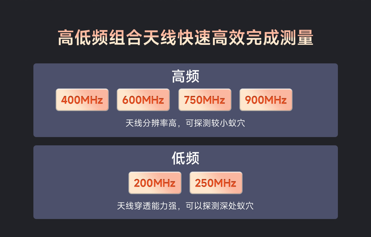 (1)高频段采用 400/600/750/900MHz天线分辨率高,可探测较小蚁穴;