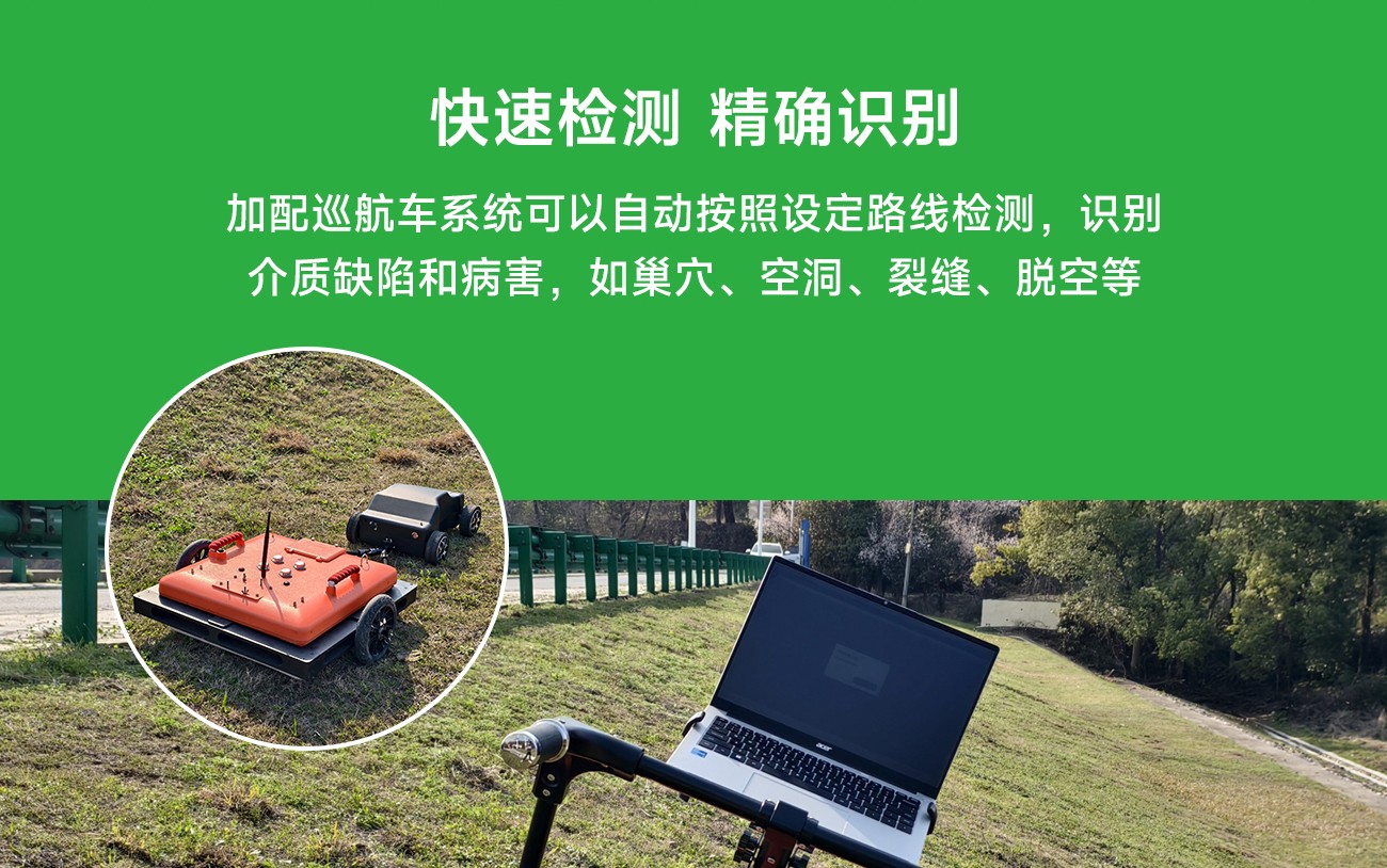 快速检测,精确识别:自动巡航系统可以自动按照设定路线进行检测,识别介质缺陷和病害,如巢穴、空洞、裂缝、脱空等;