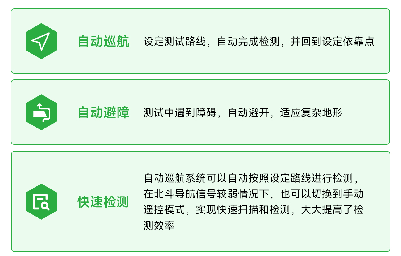 3 快速检测 自动巡航系统可以自动按照设定路线进行检测,在北斗导航不良的情况下,也可以切换到手动遥控模式,实现快速扫描和检测,大大提高了检测效率。
