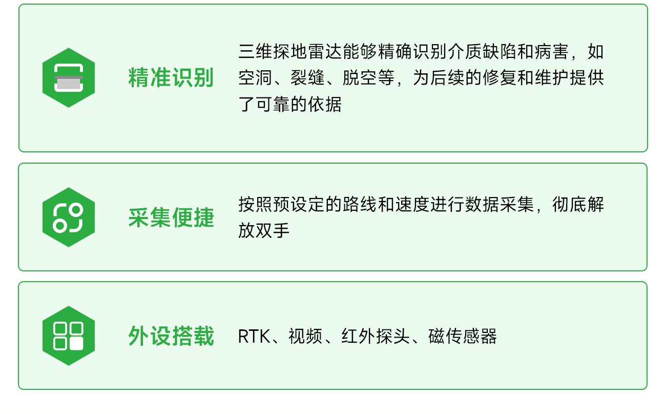4 精确识别 三维探地雷达能够精确识别介质缺陷和病害,如空洞、裂缝、脱空等,为后续的修复和维护提供了可靠的依据。