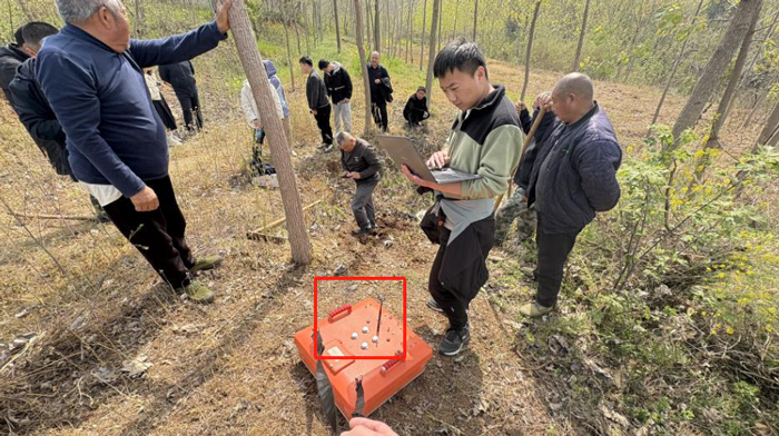 1.图2-1为现场实际探测区域,图2-2为设备探测结果,图2-2红色方框是抛物线状,经现场测试判定为异常点,深度在80cm左右,疑似存在蚁穴,开挖验证后证实确为蚁巢主巢。验证图如2-3所示。