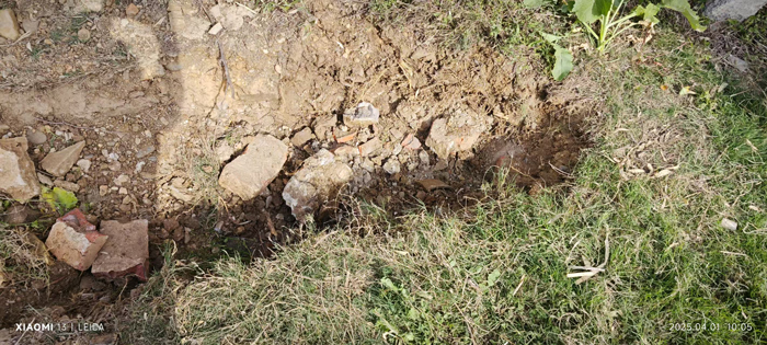 2.图1-2地点位于图1-1右侧3米处,判定为异常点,现场分析为该区域存在不密实和脱空,深度在60cm左右,开挖验证,此处为砖块如图1-3所示。