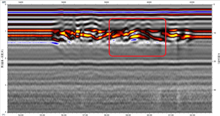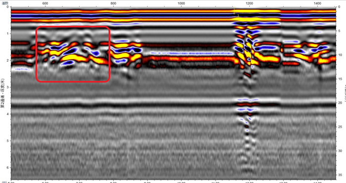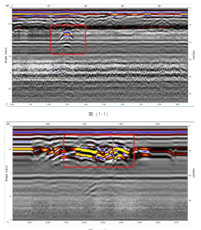 1.图1-1红色方框是抛物线状,判定为异常点,经过多次复测该区域,此区域显示条状分布,呈规律状,经过现场负责人沟通后了解该异常点是一条管线,埋深在70cm左右。