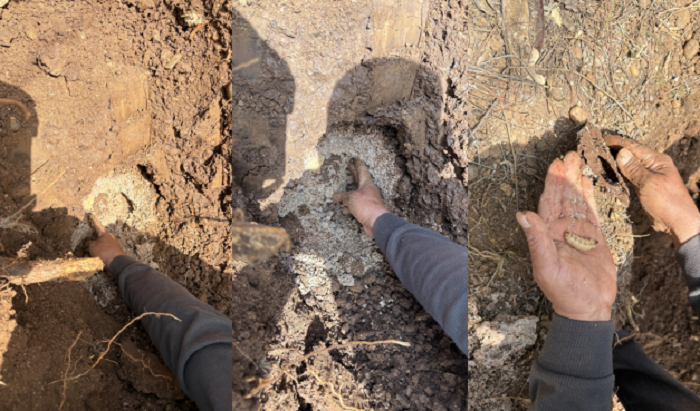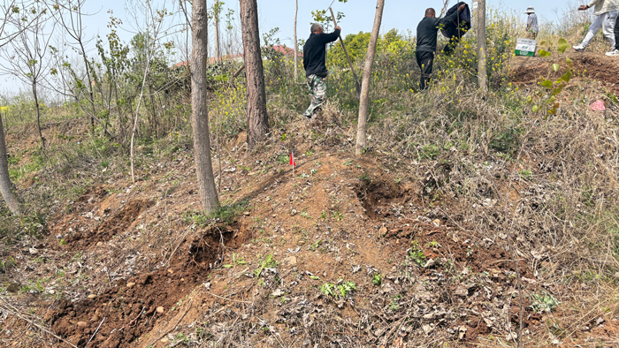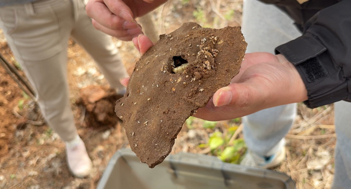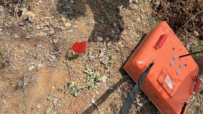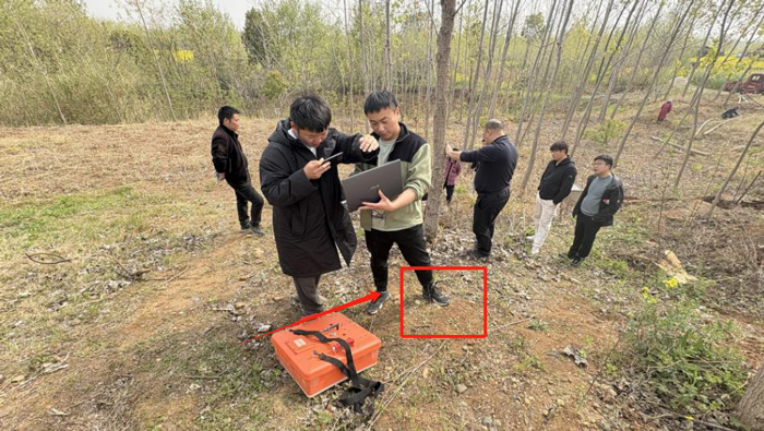 图3-1为现场实际探测区域,图3-2为设备探测结果,图3-2红色方框上面成抛物线状、下部成不密实反应,经现场测试判定为异常点,深度在60cm左右,疑似存在蚁穴,开挖验证后证实确为蚁巢主巢。验证图如3-3所示。