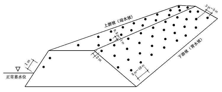 (2)监测点的布置:坝体硬化部分厚度大于10cm时,可以不布置监测点;积水区域不宜布置监测点;监测点多排布置时,应梅花状(即错位)排列。