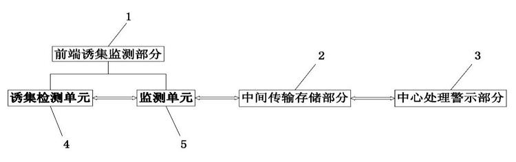 ①前端诱集监测部分(1):一般设置在白蚁危害区域,包括诱集检测单元(4)和监测单元(5)。前者主要利用诱饵引诱白蚁,并监测集群白蚁的干扰信号;后者主要对该信号进行传输和处理。